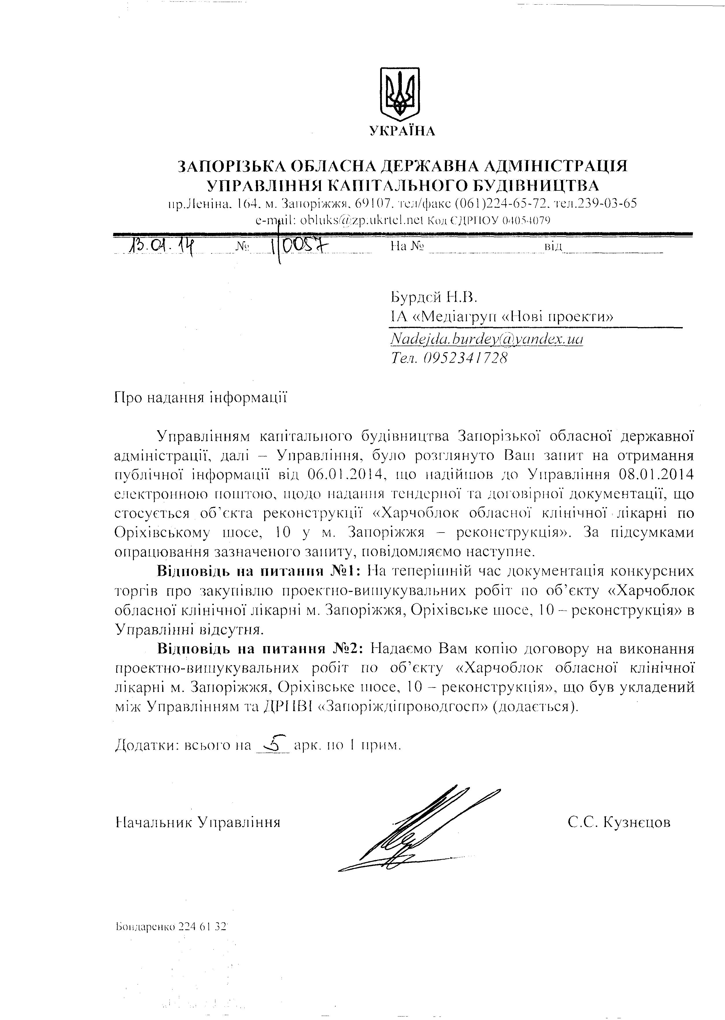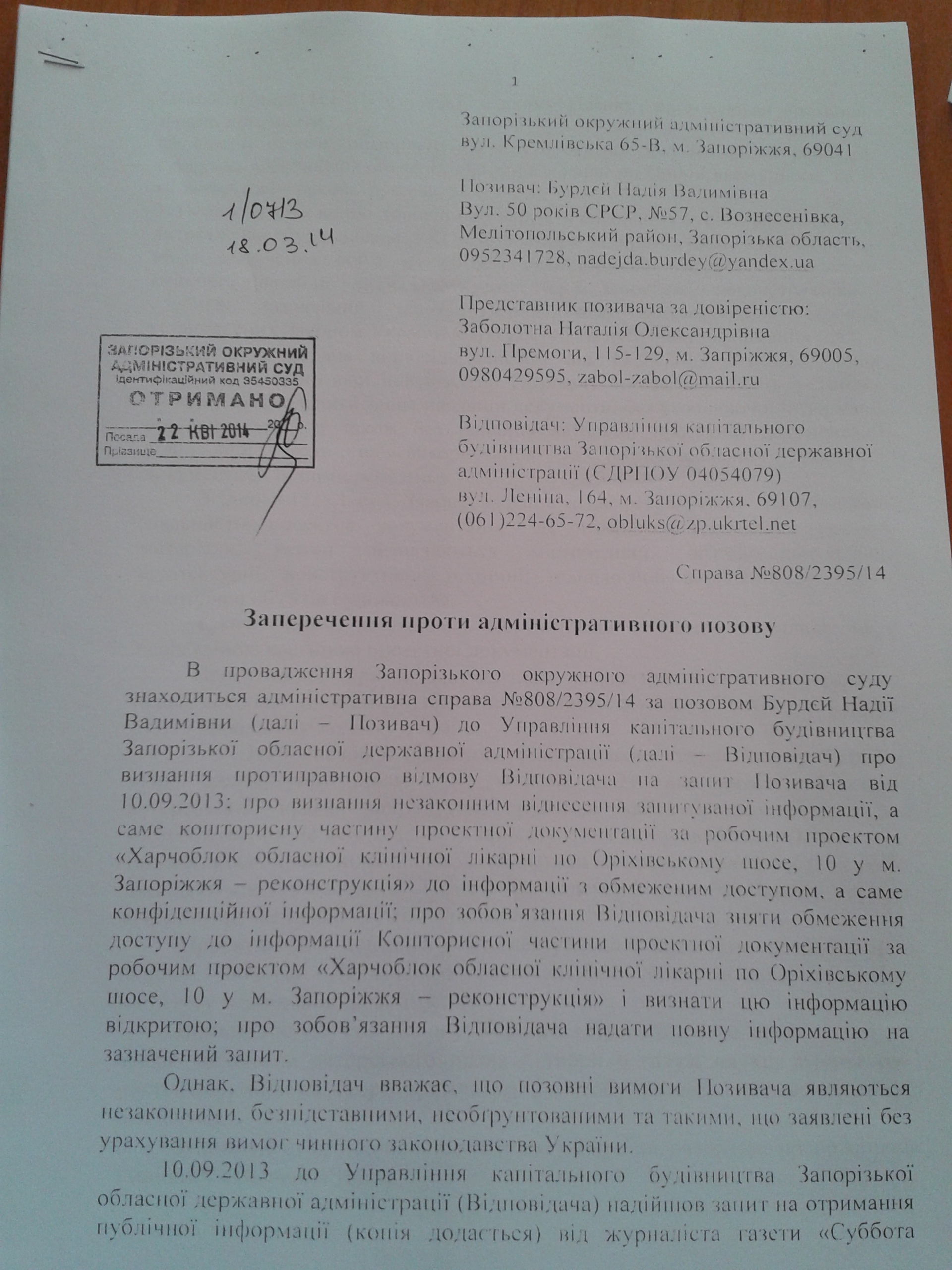 23 квітня 2014 року пройшло перше засідання суду за позовом журналісту Надії Бурдєй до Управління капітального будівництва Запорізької ОДА з приводу відмови в наданні публічної інформації.