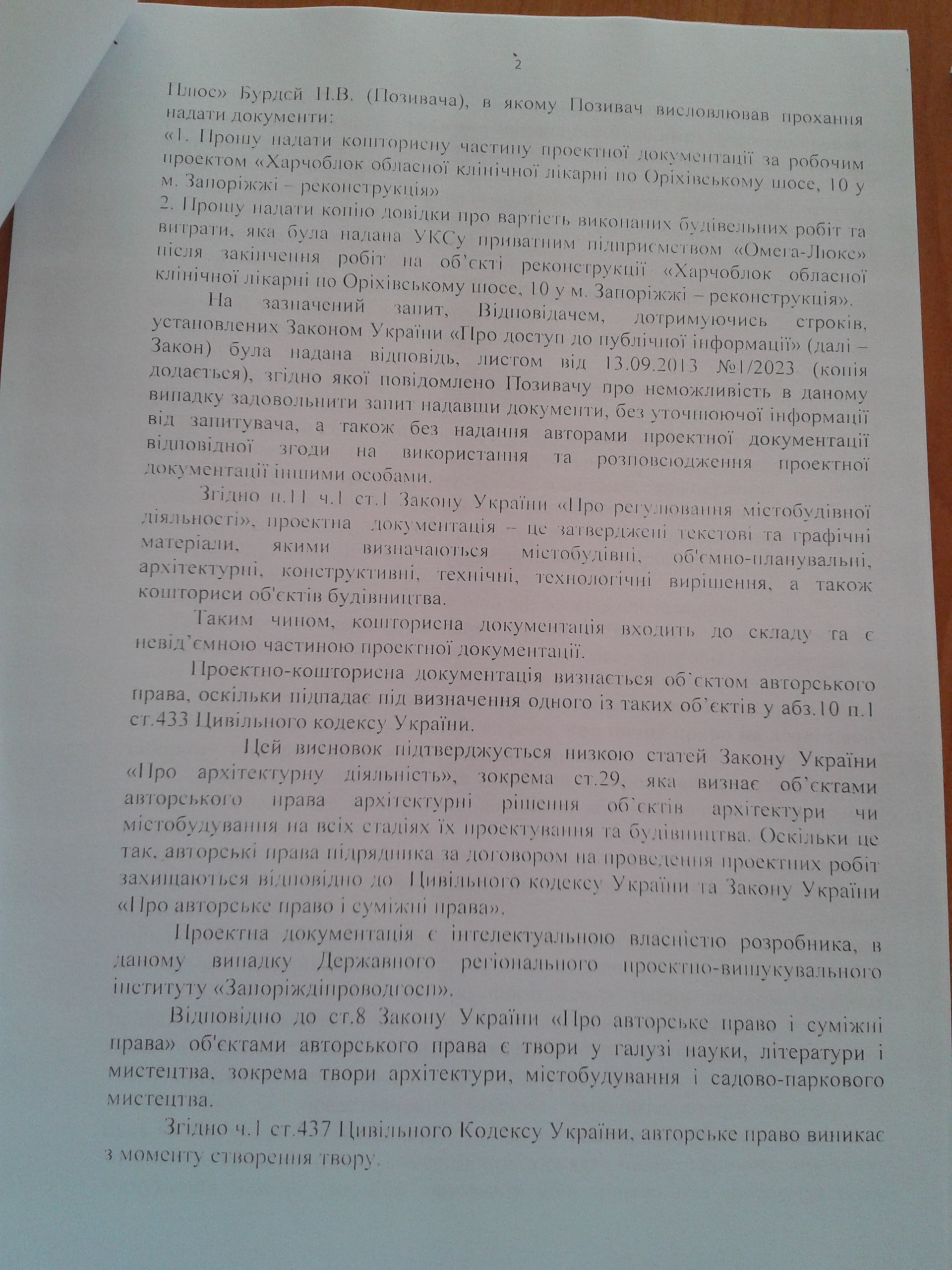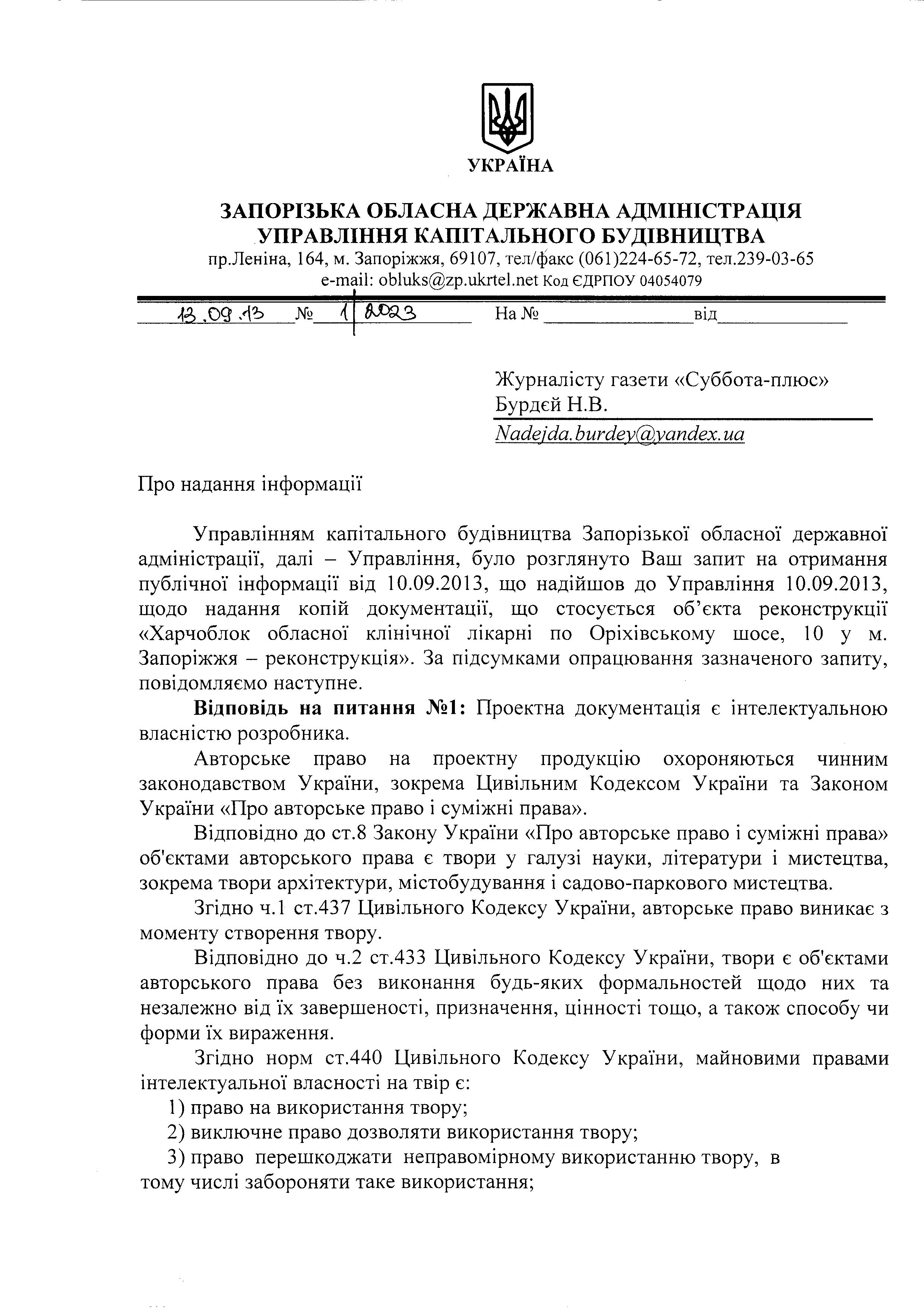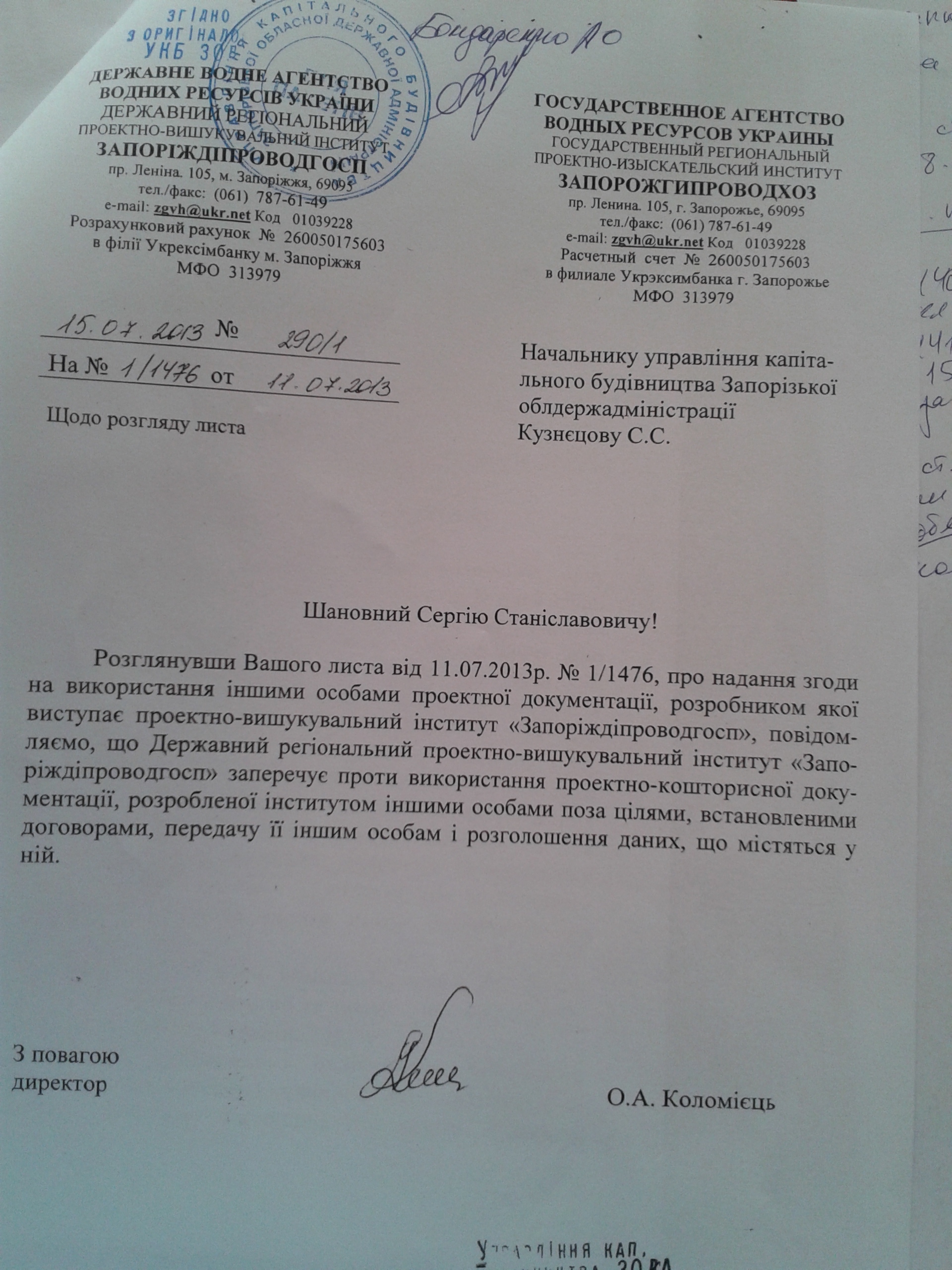 1.Ніде у листі ГРПІІ «Запоріжгіпроводхоз» № 290/1 від 15.07.2013 р. мова не йде про авторське право.
