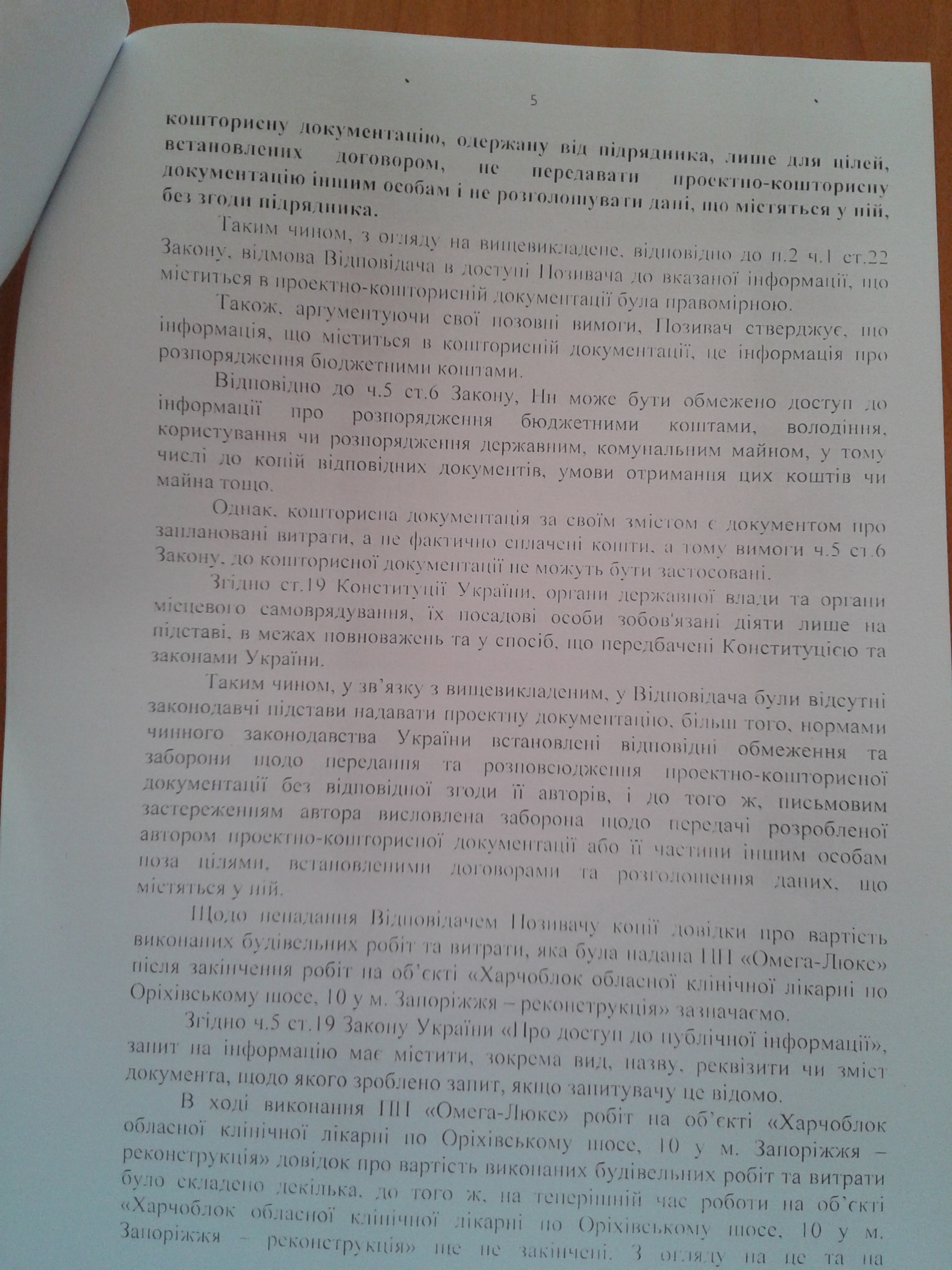 Кошторисну частину проектної документації за робочим проектом «Харчоблок обласної клінічної лікарні по Оріхівському шосе, 10 у м.Запоріжжі — реконструкція», а також копії всіх документів, що підтверджують вартість виконаних будівельних робіт та витрати; в т.ч. ті, які були надані УКСу приватним підприємством «Омега-Люкс» після закінчення робіт на об’єкті реконструкції «Харчоблок обласної клінічної лікарні по Оріхівському шосе, 10 у м.Запоріжжі — реконструкція».
