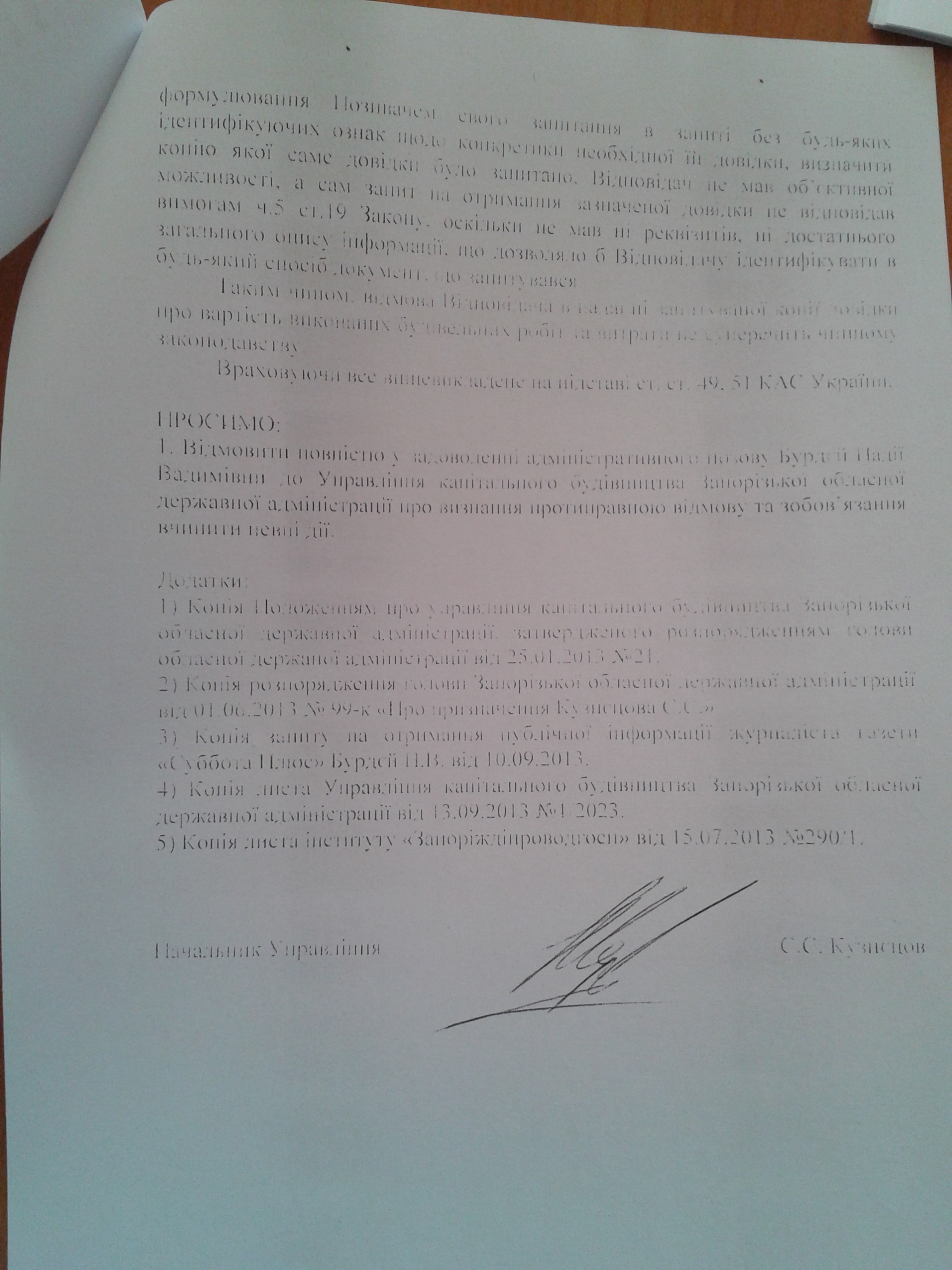 1. Визнати протиправною відмову Управління капітального будівництва Запорізької обласної державної адміністрації на запит Бурдєй Надії Вадимівни від 10 вересня 2013 року.