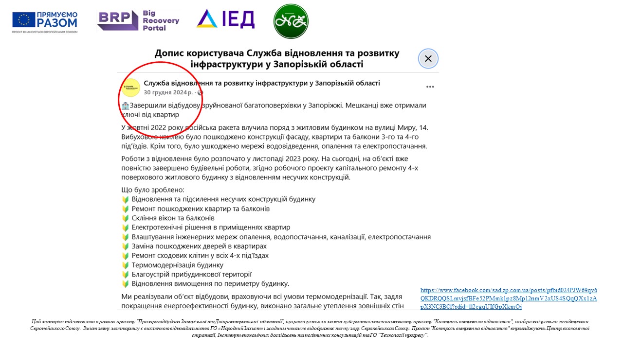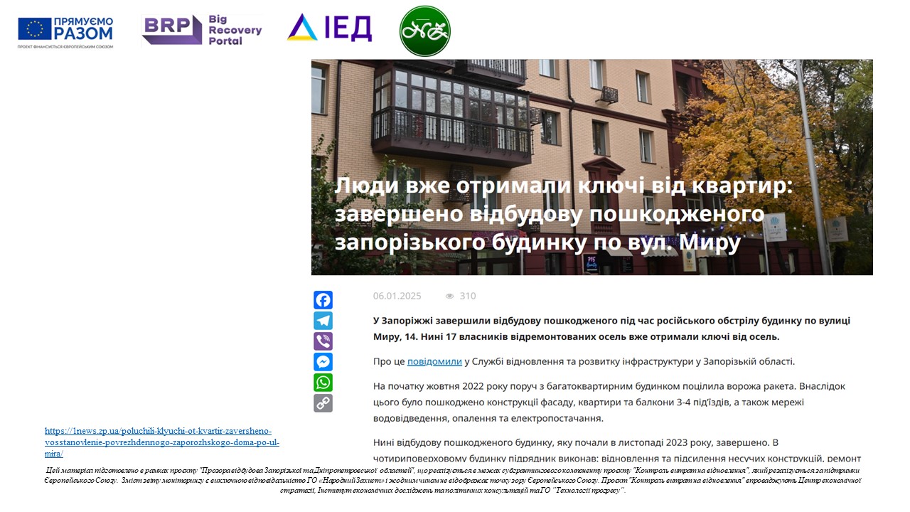 При тому, що запорізькі медіа, з посиланням на Замовника (Службу відновлення та розвитку інфраструктури у Запорізькій області) широко інформували про завершення ремонтних робіт і отримання мешканцями ключів до своїх відремонтованих квартир, ще в січні 2025 року.https://1news.zp.ua/poluchili-klyuchi-ot-kvartir-zaversheno-vosstanovlenie-povrezhdennogo-zaporozhskogo-doma-po-ul-mira/