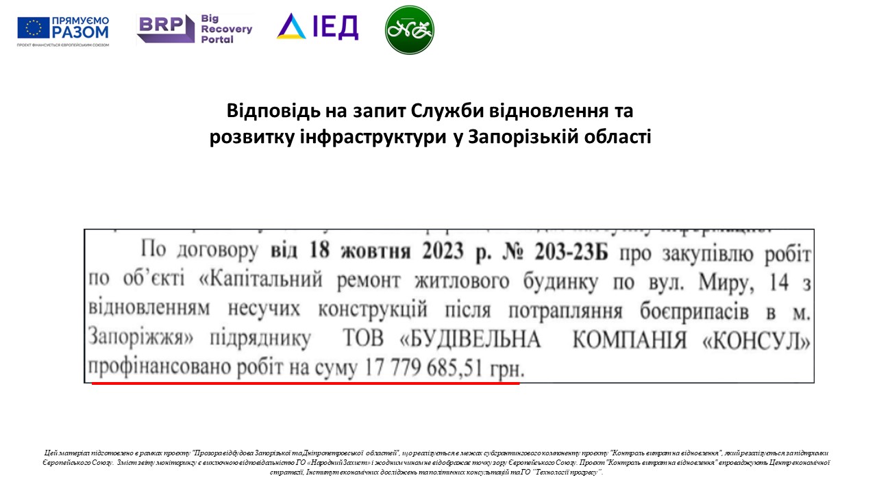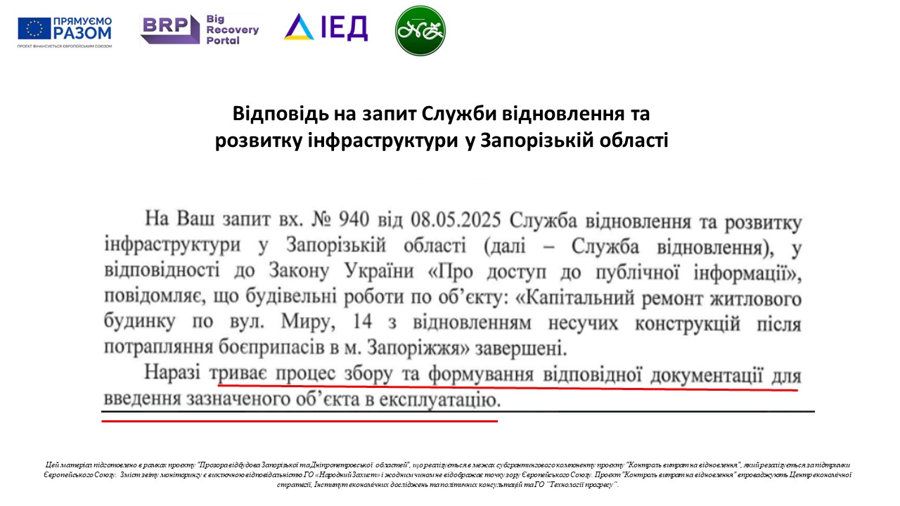 Служба відновлення та розвитку інфраструктури у Запорізькій області не забезпечує інформування громадян про стан реалізації проєктів відбудови/відновлення на належному рівні. Не обійшлось і без проблем зі здачею об’єкту в експлуатацію, що вже стало візитівкою Запоріжжя. В якому «підземні школи» по півроку працюють без офіційного введення в експлуатацію. Будинок №14 по вул.Миру також не виключення. Заселені запорізькою владою ще у січні мешканці будинку і досі проживають в об’єкті, який не здано в експлуатацію.