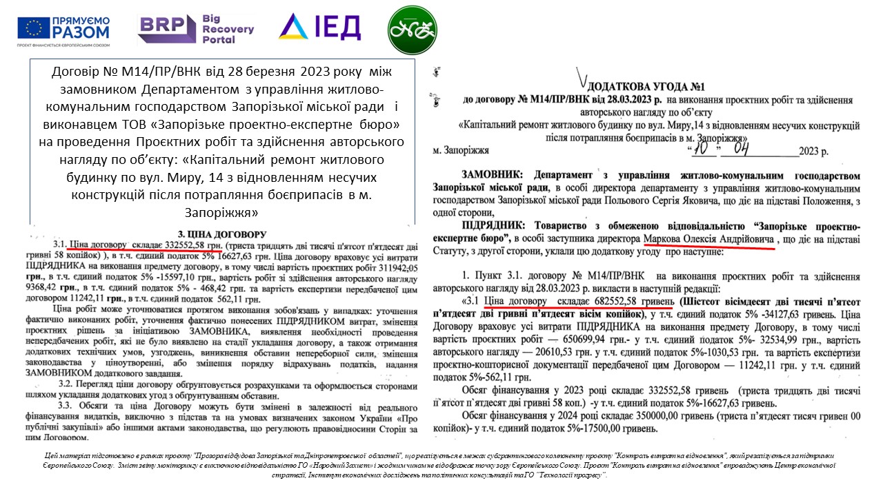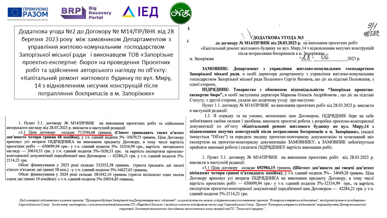 В результаті внесення змін до договору про розробку проєктної документації Департамент з управління житлово-комунальним господарством Запорізької міської ради разом з підрядником вдвічі підняв ціну договору№М14/ПР/ВНК від 28.03.2023, при цьому вивевши роботи з авторського нагляду в окремий договір і окрему закупівельну процедуру: