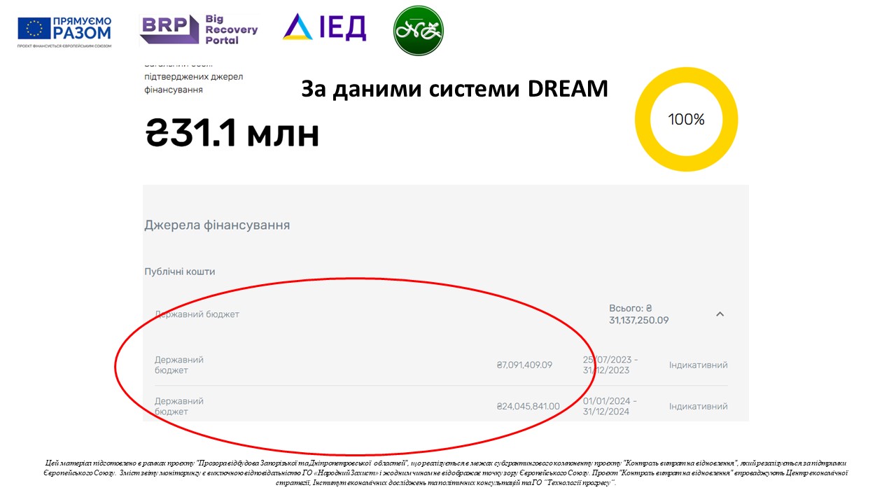Згідно даних системи DREAM, бюджет проєкту становить 31 137 250,09 грн. Головним розпорядником бюджетних коштів і Замовником є Служба відновлення та розвитку інфраструктури у Запорізькій області. Яка за процедурою відкритих торгів з особливостями обрала виконавця ремонтних робіт і робіт з технічного нагляду, а також без застосування електронної системи обрала всіх інших підрядників: