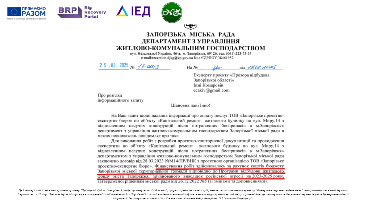 Згідно відповіді н запит вих.№ 13-0043 від 25.03.2025 року, оплата робіт з виготовлення проєктно-кошторисної документації ТОВ «Запорізьке проектно-експертне бюро здійснена за рахунок коштів бюджету Запорізької міської територіальної громади.